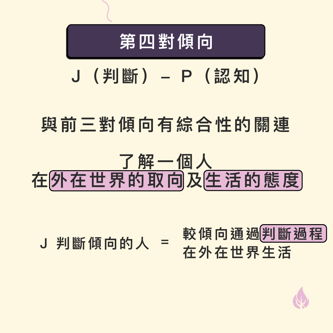 較傾向通過認知過程在外在世界生活的,就是P(認知)傾向;較傾向通過判斷過程在外在世界生活的,就是J(判斷)傾向。