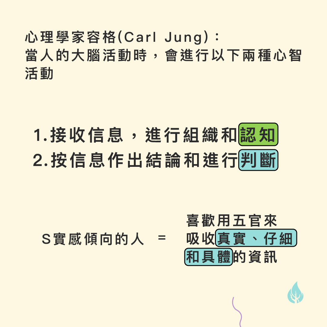 心理學家容格(Carl Jung)觀察到人類有不同的行為,是因為各種天生不同傾向的人在運用心智方面會有所不同,他觀察到當人的大腦活動時,會進行以下兩種心智活動: 接收信息,進行組織和認知 按信息作出結論和進行判斷 而我們人生中從小到大都是不斷在進行認知和判斷的過程: 當要選擇學校,要收集不同學校的資訊進行比較、聽取老師和父母的意見、衡量自己的能力,然後才決定讀哪間學校。 畢業後要選擇投身甚麼職業,要認知自己的興趣、社會的發展、不同行