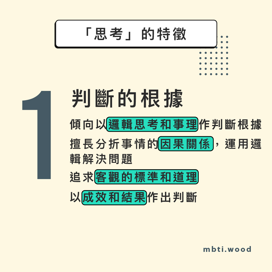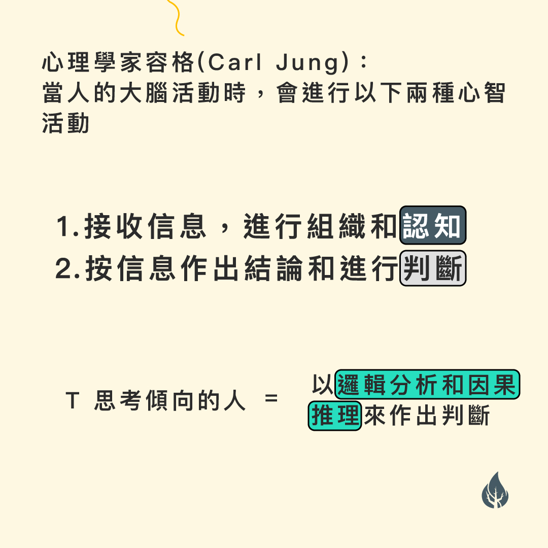 前文提及到榮格發現人的大腦活動時,會進行以下兩種心智活動: 接收信息,進行組織和認知 按信息作出結論和進行判斷 當人以「實感」(Sensing)或「直覺」(Intuition)兩種不同傾向去吸收和認知信息後,會將這些信息進行組織和結論,以致作出相應的判斷。榮格發現人在判斷的過程中分為「思考」(Thinking)和「情感」(Feeling)兩種,「思考」(Thinking)傾向的人以邏輯分析和因果推理來作出判斷,「情感」(Feelin