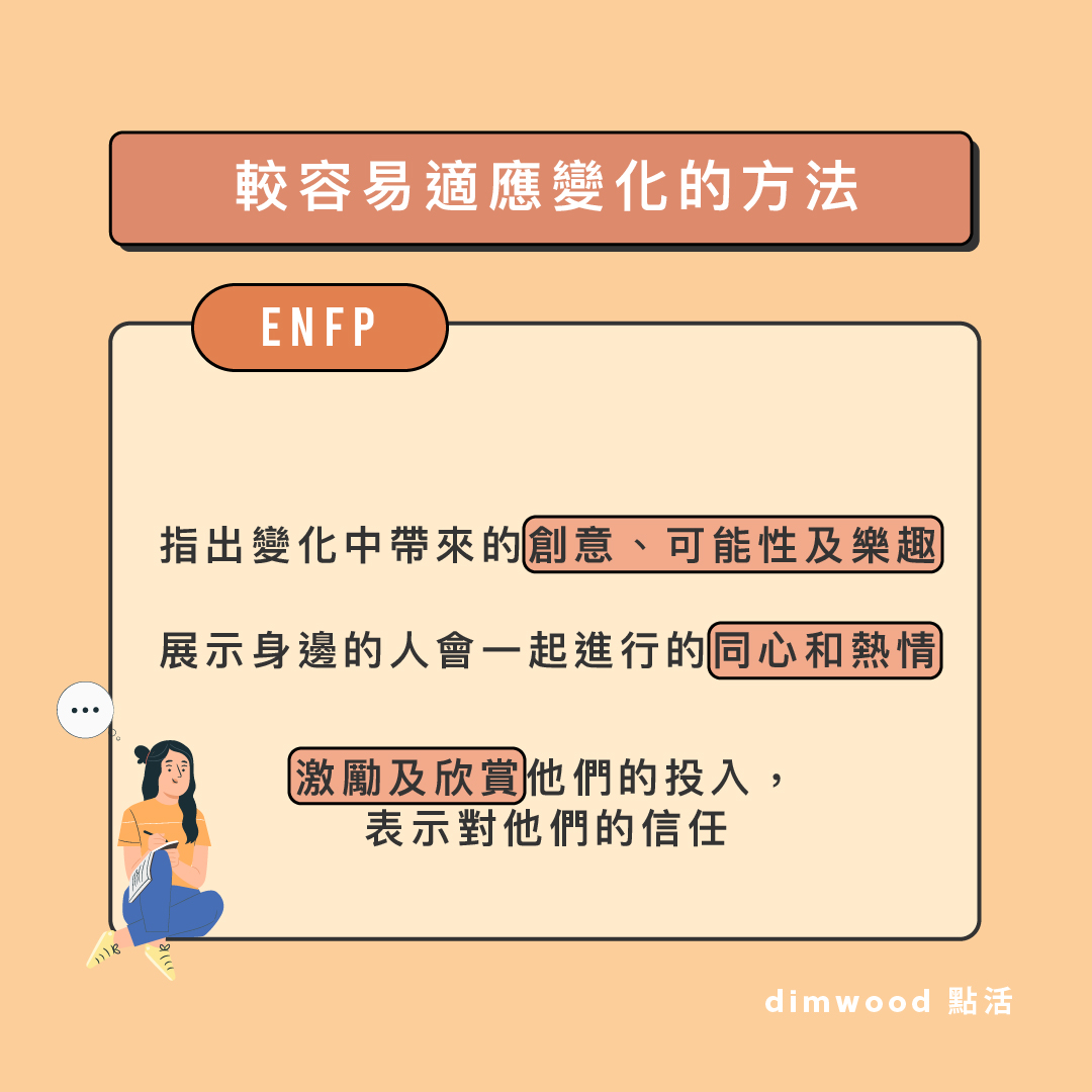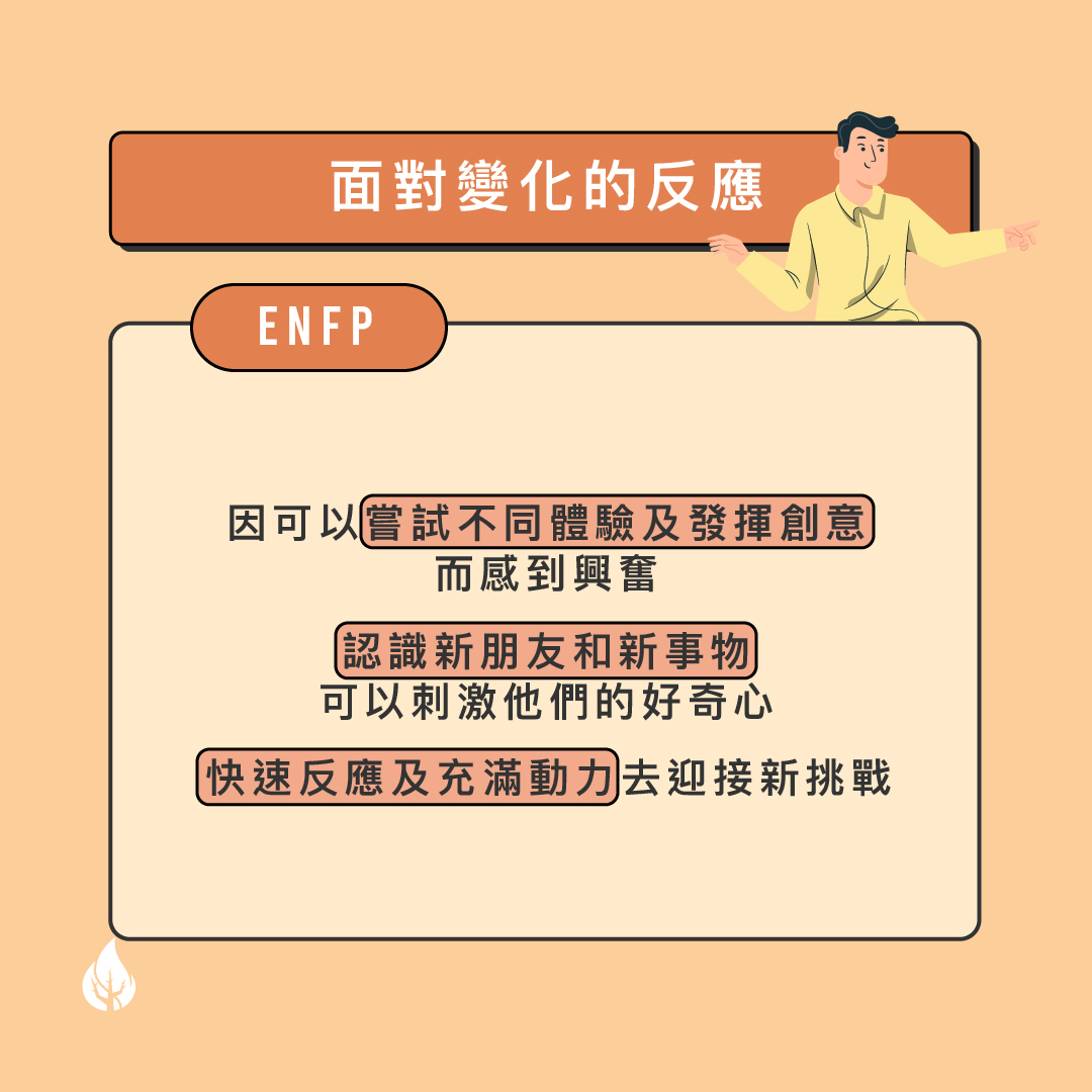 面對變化的反應 因可以嘗試不同體驗及發揮創意而感到興奮 認識新朋友和新事物可以刺激他們的好奇心 快速反應及充滿動力去迎接新挑戰 較容易適應變化的方法 指出變化中帶來的創意、可能性及樂趣 展示身邊的人會一起進行的同心和熱情 激勵及欣賞他們的投入,表示對他們的信任 對變化可以作出的貢獻 開放地徵求和接收不同意見 用富有想像力的方法解決問題 為身邊的人帶來活力及樂趣