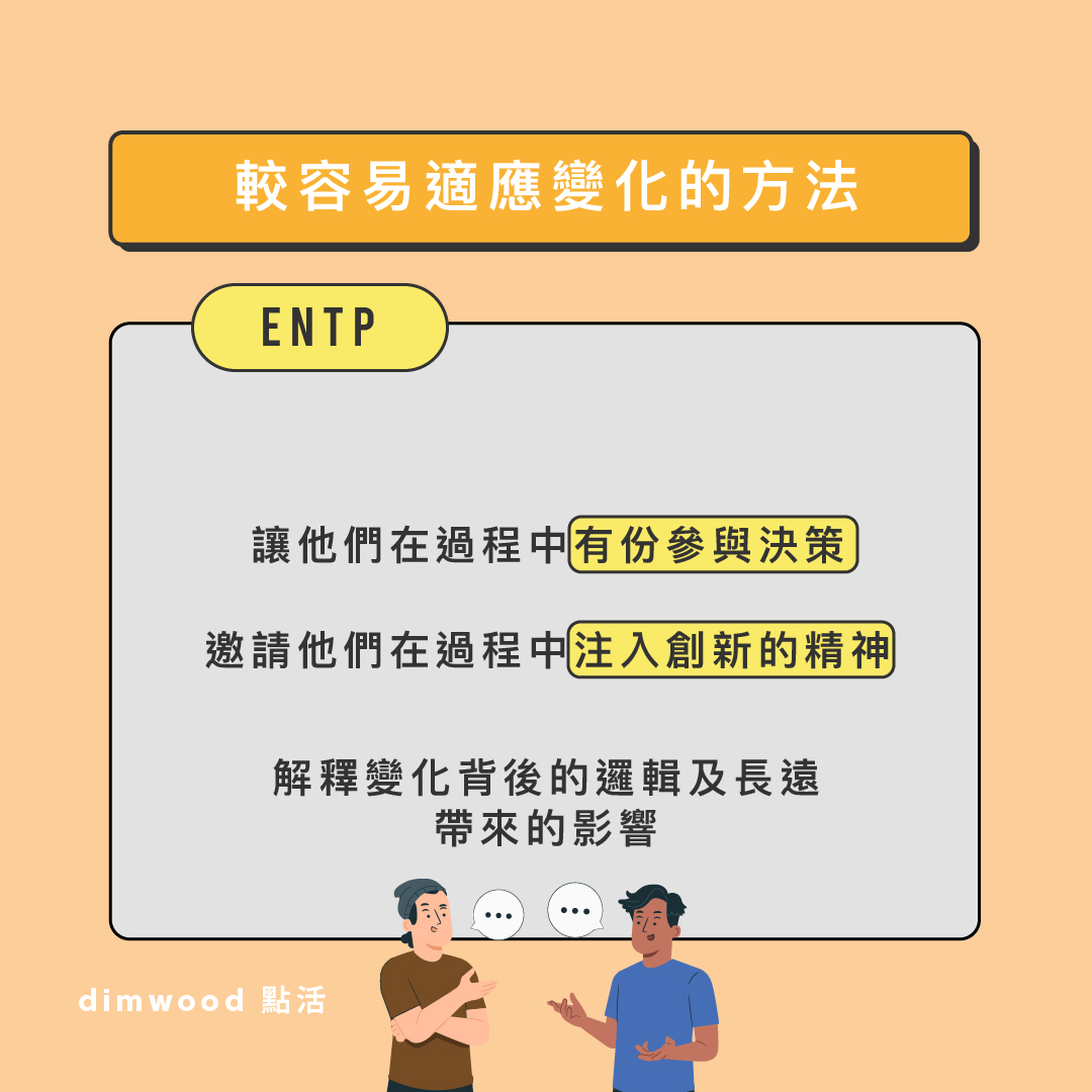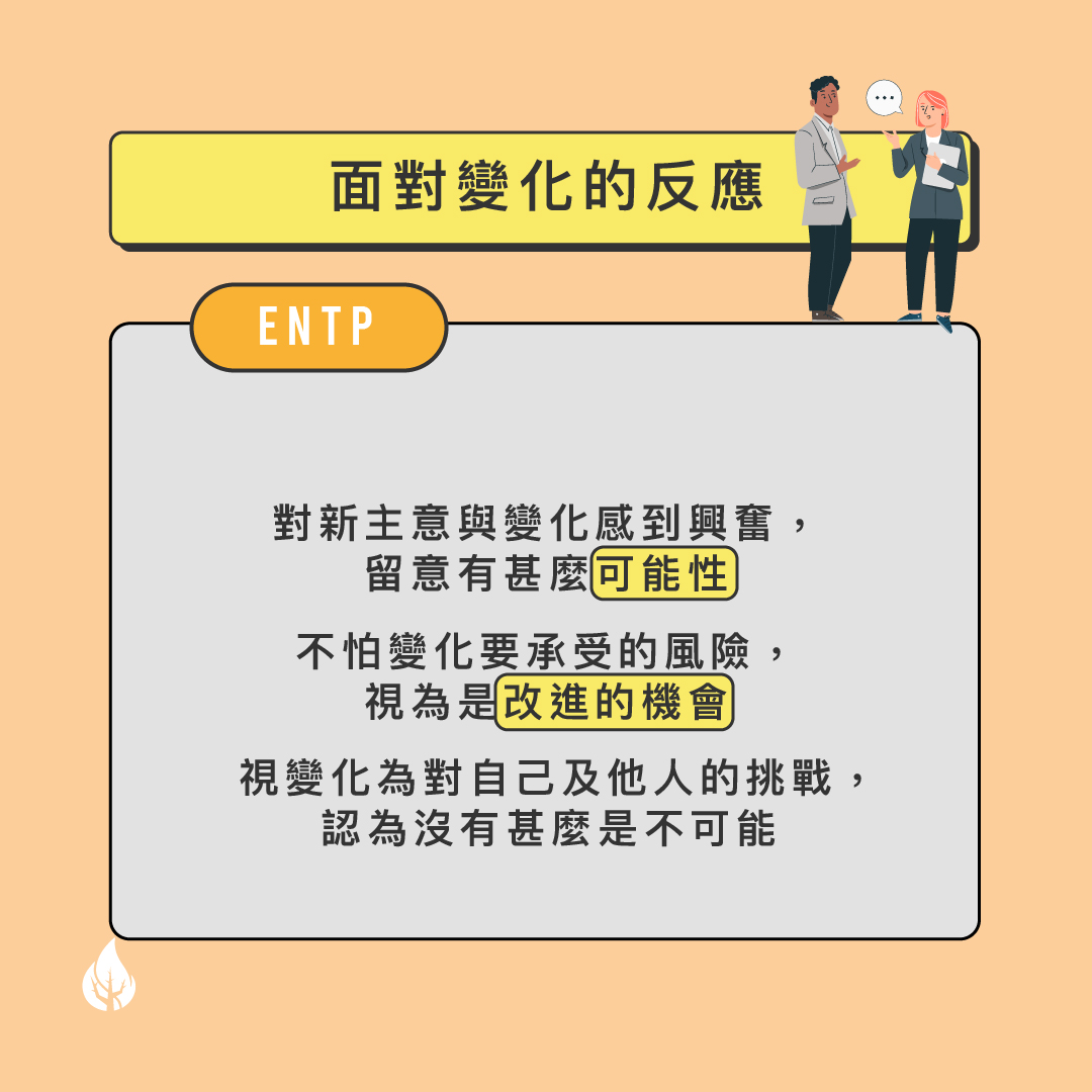 面對變化的反應 對新主意與變化感到興奮,留意有甚麼可能性 不怕變化要承受的風險,視為是改進的機會 視變化為對自己及他人的挑戰,認為沒有甚麼是不可能 較容易適應變化的方法 讓他們在過程中有份參與決策 邀請他們在過程中注入創新的精神 解釋變化背後的邏輯及長遠帶來的影響 對變化可以作出的貢獻 能輕易看出變化方案的缺點及不足之處 反應快,提出有創意的方法來處理問題和作出改進 發掘更多有效的策略及可能性達到目標