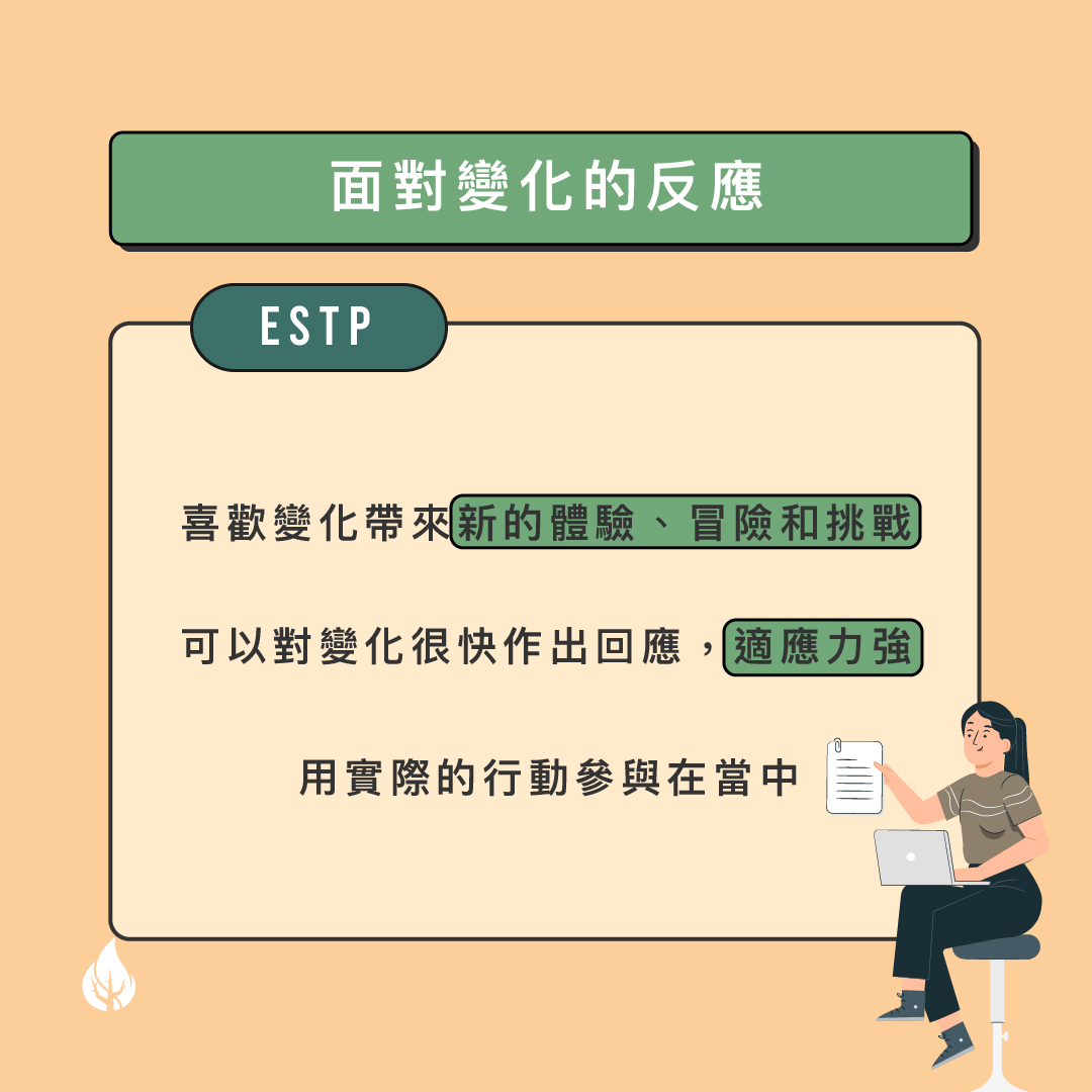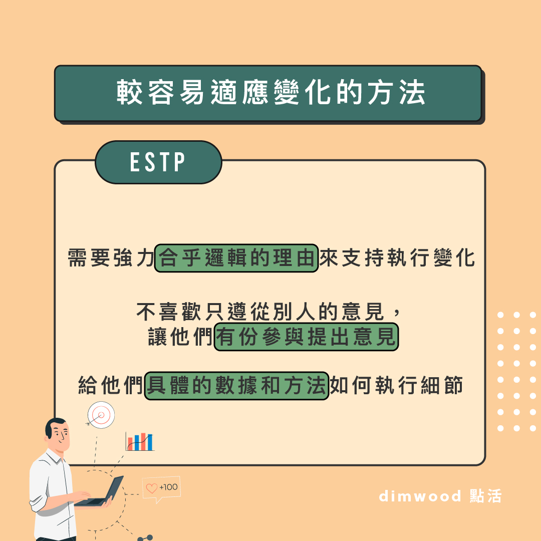 面對變化的反應 喜歡變化帶來新的體驗、冒險和挑戰 可以對變化很快作出回應,適應力強 用實際的行動參與在當中 較容易適應變化的方法 需要強力合乎邏輯的理由來支持執行變化 不喜歡只遵從別人的意見,讓他們有份參與提出意見 給他們具體的數據和方法如何執行細節 對變化可以作出的貢獻 擅於快速解決在變化中出現的問題和困難 注意細節和實際果效,如何調配資源 收集不同意見並制定最有利的方案