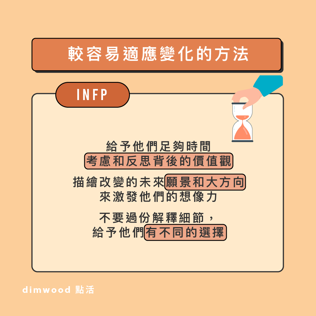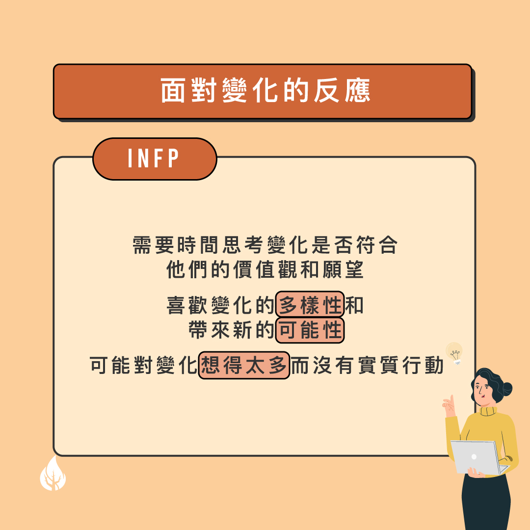 對變化的反應 需要時間思考變化是否符合他們的價值觀和願望 喜歡變化的 多樣性 和帶來新的 可能性 可能對變化 想得太多 而沒有實質行動 較容易適應變化的方法 給予他們足夠時間 考慮和反思背後的價值觀 描繪改變的未來願 景和大方向 來激發他們的想像力 不要過份解釋細節,給予他們 有不同的選擇 對變化可以作出的貢獻 運用其洞察力 揭示 變化潛在的關係和意義 鼓勵 他人用多種觀點考慮問題 維持團隊關係, 引導大家達成共識 INFP們是怎樣面對