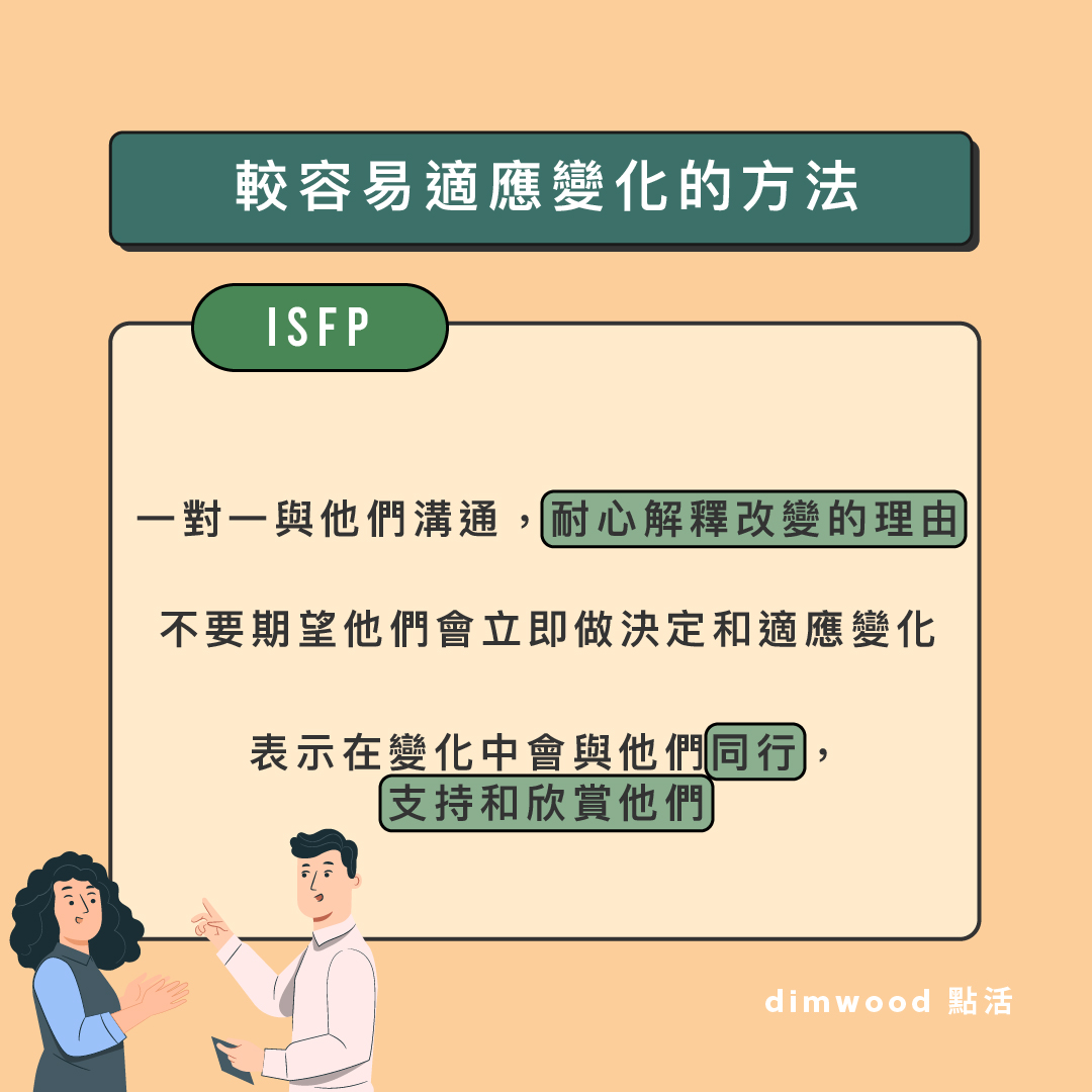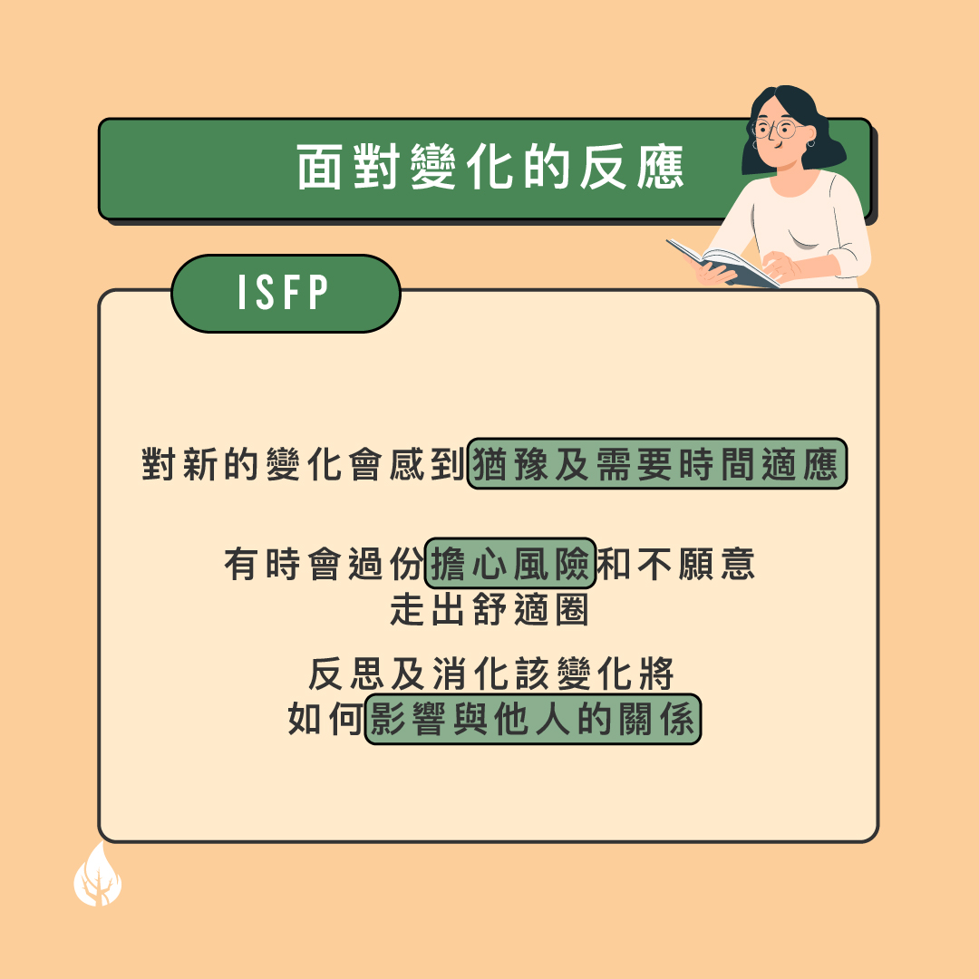 面對變化的反應 對新的變化會感到猶 豫及需要時間適應 有時會過份 擔心風險 和不願意走出舒適圈 反思及消化該變化將如何 影響與他人的關係 較容易適應變化的方法 一對一與他們溝通, 耐心解釋改變的理由 不要期望他們會立即做決定和適應變化 表示在變化中會與他們 同行,支持和欣賞他們 對變化可以作出的貢獻 關注他人 在變化中的需要並作出回應 盡責和細心地 支援和執行細節 在變化中顯示出 靈活性和耐性 ISFP們是怎樣面對變化的呢?