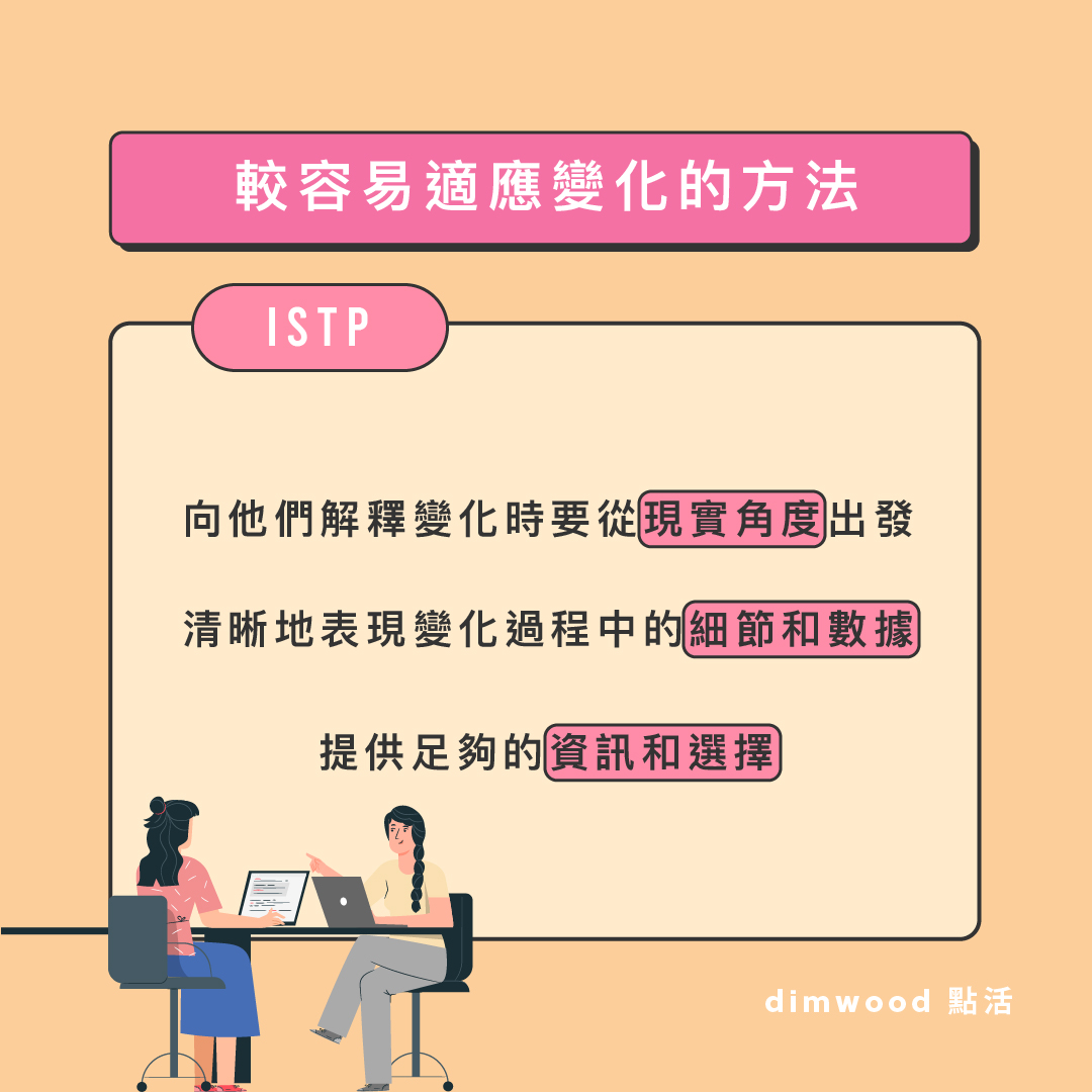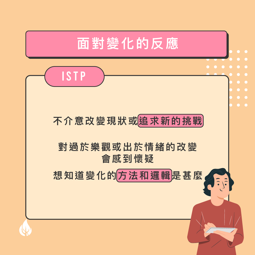 面對變化的反應 不介意改變現狀或 追求新的挑戰 對過於樂觀或出於情緒的改變會感到懷疑 想知道變化的 方法和邏輯 是甚麼 較容易適應變化的方法 向他們解釋變化時要從 現實角度 出發 清晰地表現變化過程中的 細節和數據 提供足夠的 資訊和選擇 對變化可以作出的貢獻 掌握及執行實 在的細節 留意過程的 實用性 使變化能夠順利實現 提出如何操作可以使變化 有效率和有成效 ISTP們是怎樣面對變化的呢?