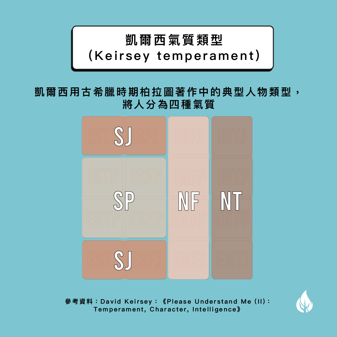 凱爾西用「氣質」的角度來描述16種人格的特點,並將他們分成四種氣質,每一種氣質再分為四個類別,正正與MBTI十六種類相對應。