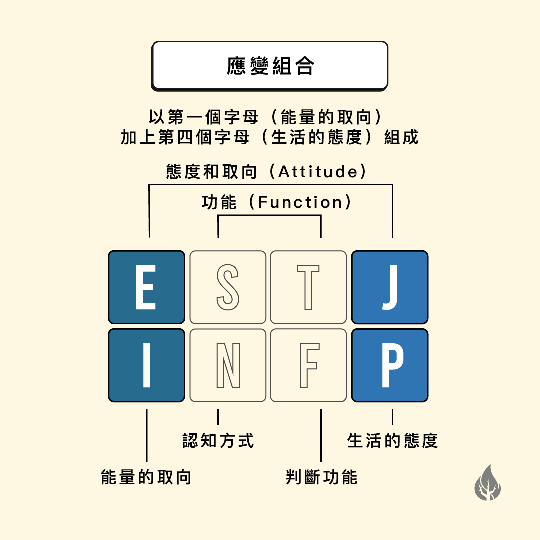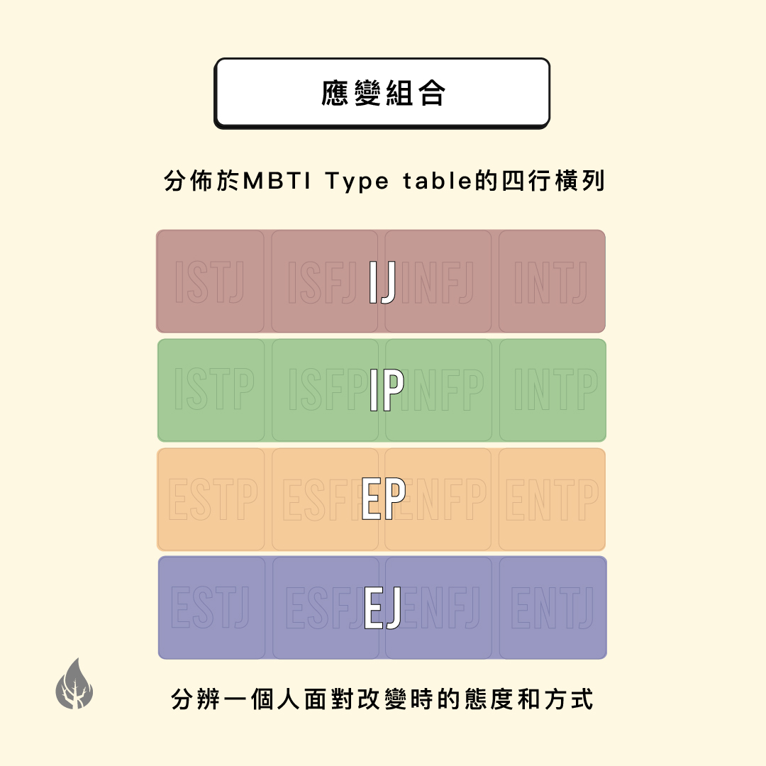 「應變組合」是由每種性格類型的第一個字母[能量的取向:E(外向)和I(內向)]加上第四個字母[生活的態度:J(判斷)和P(認知)]組合而成,由於兩個傾向都是形容一個人在生活上的能量取向和態度,所以較易在日常生活中的待人處事中展示出來。