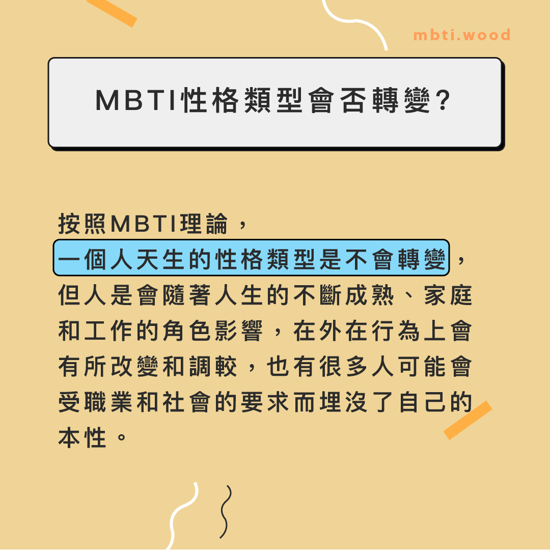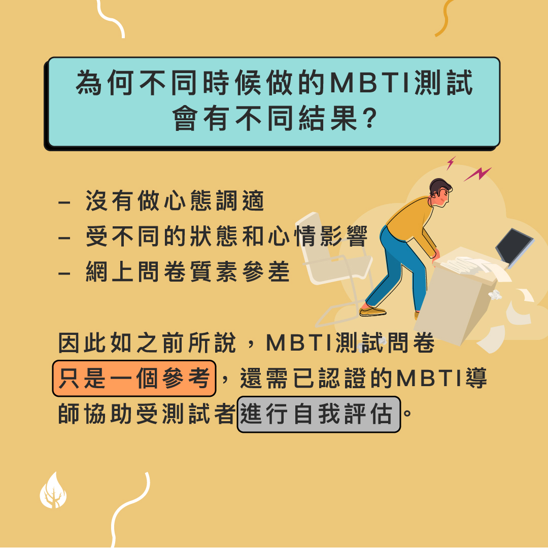 1.為何不同時候做的MBTI測試會有不同結果? 【心態調適】 因為做測試問卷時需要先做「心態調適」,意思是答問題時不要想像在工作的處境, 因為在工作中有著責任和壓力,作出的回答並不能反映自己最原本的性格。 【不同的狀態和心情】 人在不同時候和階段會有不同的狀態,在不同心情下作出的決定也會有所不同, 例如在心情低落或很累時自然不想見人。 【網上問卷質素參差】 網上雖然有不少的MBTI測試問卷,但質素有參差,不一定是專業和準確的問卷。
