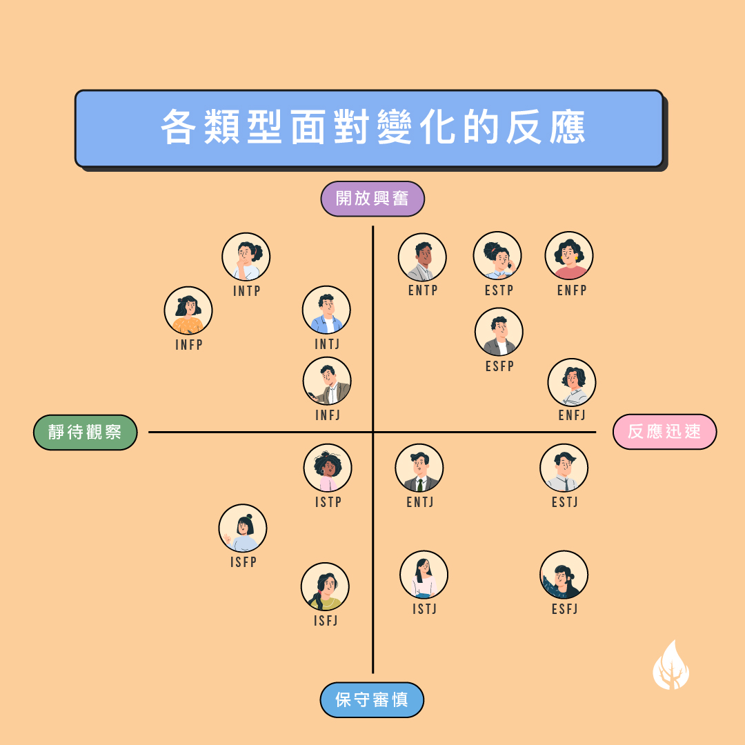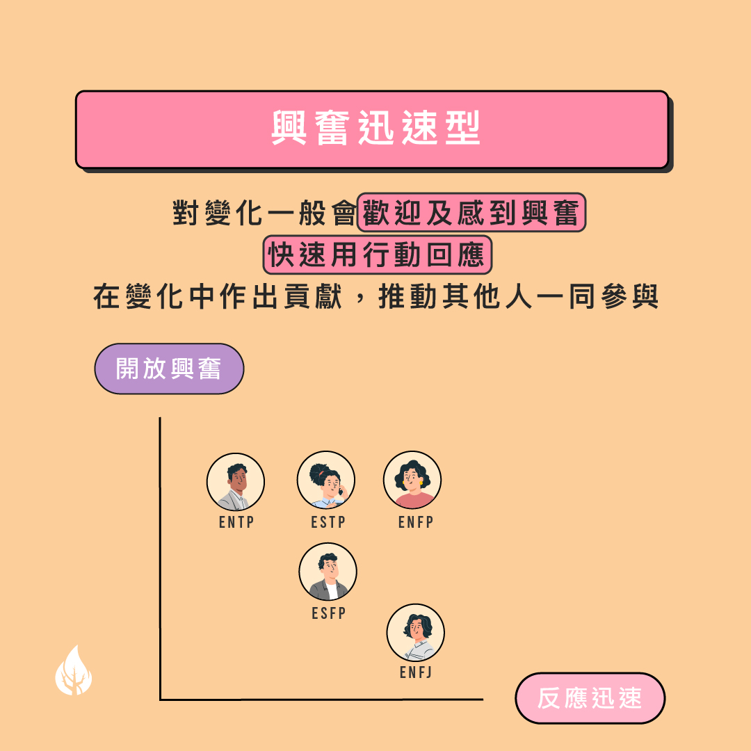 總結各性格類型對突如其來的變化會有不同的反應,有些會較容易開放和接受,有些會持審慎保守的態度。當接受該變化後,相應的行動速度也會有所不同,有些會先靜待其變,有些會行動迅速。歸納會有以下四種不同的組合: 興奮迅速型:這些類型對變化一般會歡迎及感到興奮,並且會快速用行動回應,在變化中作出貢獻,推動其他人一同參與。 開放觀察型:這些類型對變化是保持開放的態度,但要一段時間去反思背後的邏輯及價值觀是否符合他們的理念,有待一定程度的觀察及了解後才
