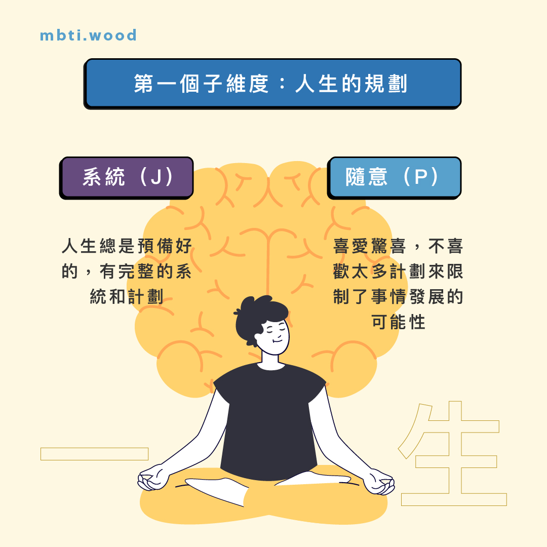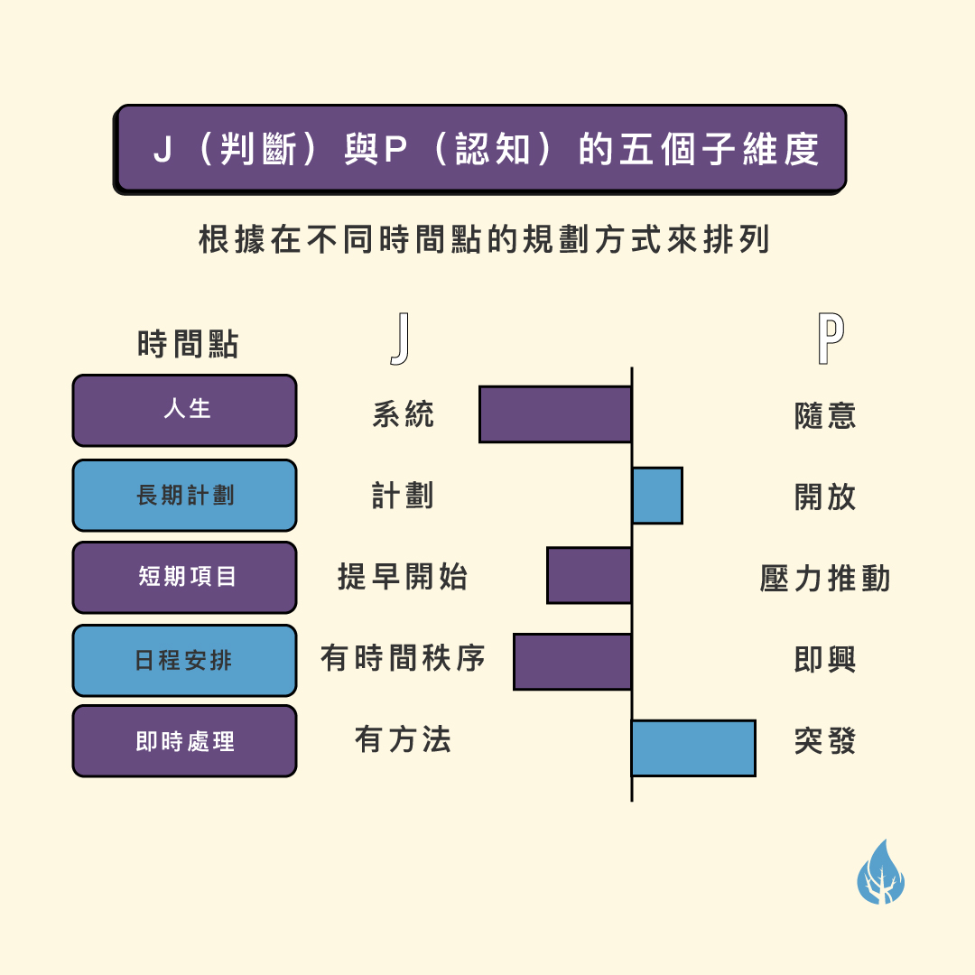 J(判斷)與P(認知)是指一個人生活的態度,而五個子維度是根據一個人在處事時的安排和組織方法、如何對外界的人與事作出規劃來排列。