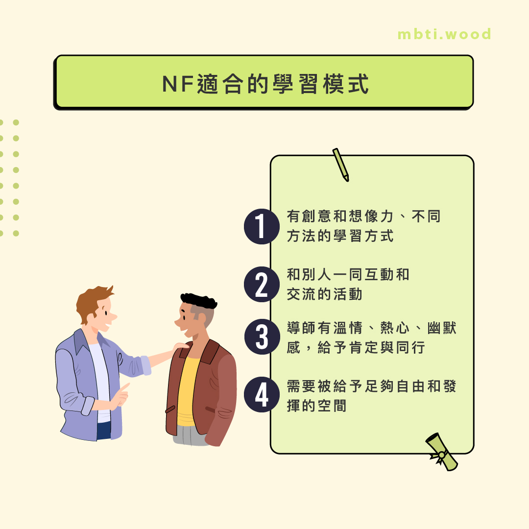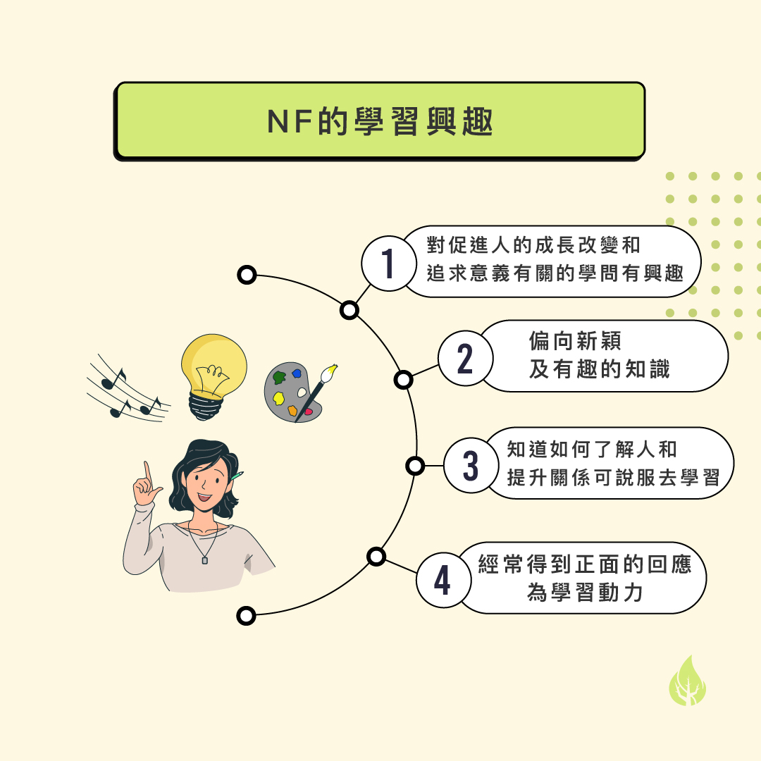 【 NF的學習興趣 】 - 對促進人的成長改變和追求意義有關的學問有興趣 - 偏向新穎及有趣的知識 - 知道如何了解人和提升關係可說服去學習 - 經常得到正面的回應為學習動力 【 NF的學習模式 】 - 有創意和想像力、不同方法的學習方式 - 和別人一同互動和交流的活動 - 導師有溫情,熱心,幽默感,給予肯定與同行 - 需要被給予足夠自由和發揮的空間 【INFJ的學習模式】 突出的學習特質:高度掌握概念和意義的學習者 學習環境: