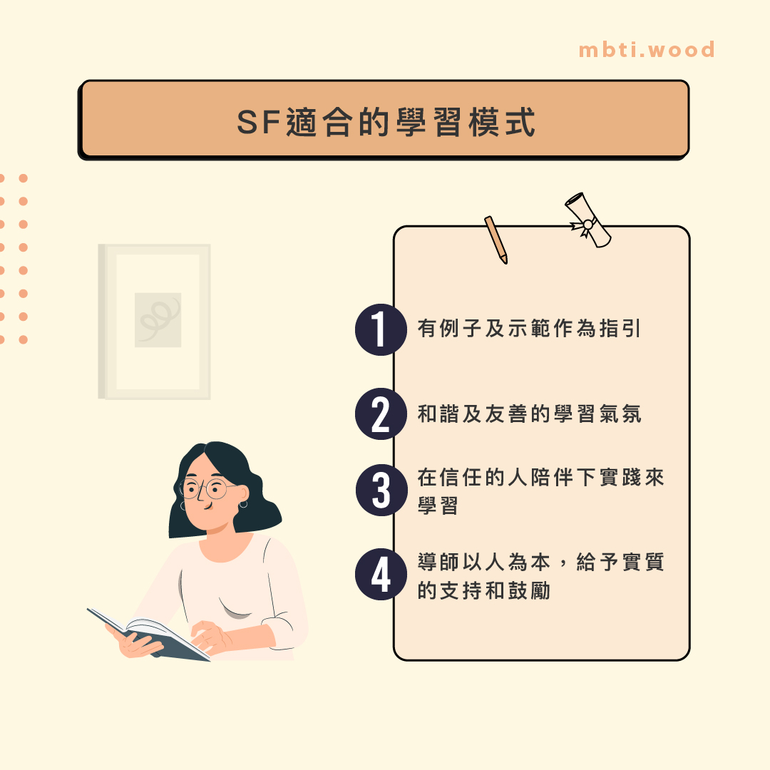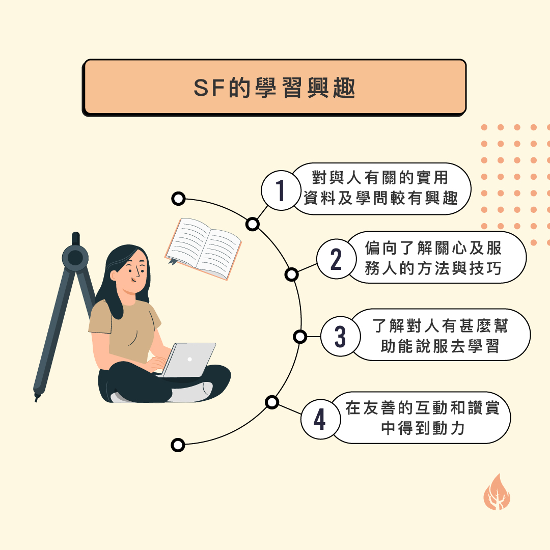 【SF的學習興趣】 - 對與人有關的實用資料及學問較有興趣 - 偏向了解關心及服務人的方法與技巧 - 了解對人有甚麼幫助能說服去學習 - 在友善的互動和讚賞中得到動力 【SF適合的學習模式】 - 有例子及示範作為指引 - 和諧及友善的學習氣氛 - 在信任的人陪伴下實踐來學習 - 導師以人為本,給予實質的支持和鼓勵 【ISFJ的學習模式】 突出的學習特質:記憶力強及著重細節 學習環境:得到尊重和欣賞的學習環境 學習模式:透過小組互