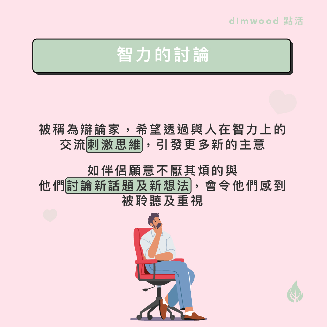 ENTP是富有創意、靈活多變、主動積極的人,他們擅長社交,追求與伴侶的關係不斷改善和成長,因此在情感上他們會用以下的方式去表達和接收愛意。 1.智力的討論 ENTP被稱為辯論家,其實他們不是喜歡甚麼事也同人辯論,只是想透過與人在智力上的交流和討論可以刺激思維,透過互動而引發更多新的主意。因此如伴侶願意接受他們這種表達和溝通的方式,不厭其煩的與他們討論新話題及新想法,這會令他們感到被聆聽及重視。 2.讚賞的言語 ENTP口才了得,很懂得用