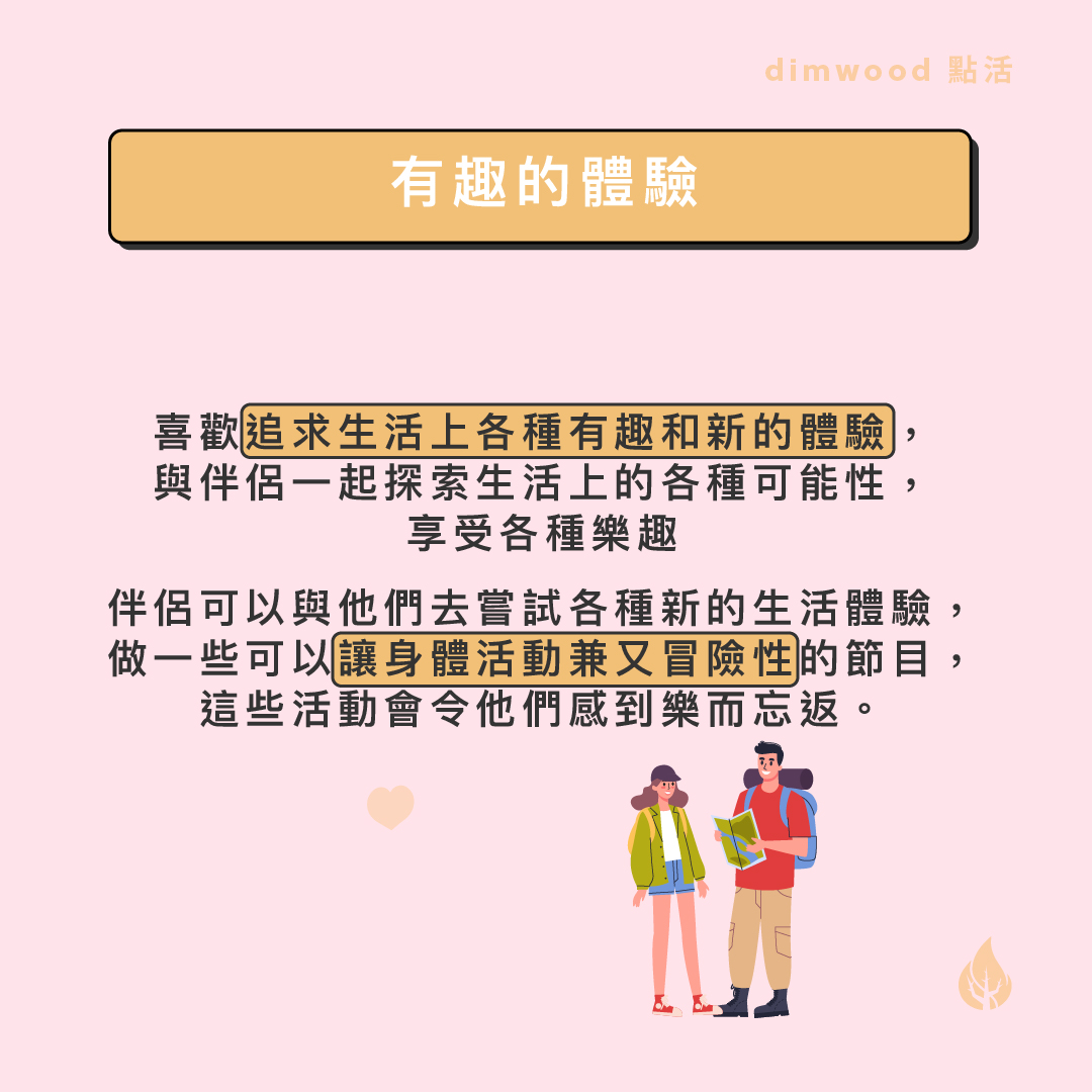 ESFP是善於交際、充滿活力、追求樂趣的人,他們喜歡和伴侶有互動及風趣的相處,享受自由快樂的生活,因此在情感上他們會用以下的方式去表達和接收愛意。 1.有趣的體驗ESFP喜歡追求生活上各種有趣和新的體驗,因此他們喜歡與伴侶一起探索生活上的各種可能性,享受各種樂趣。因此伴侶可以與他們去嘗試各種新的生活體驗,例如去風景怡人的地方遠足、新的餐廳吃飯;做一些可以讓身體活動兼又冒險性的節目,例如攀石、划艇、Wargame等,這些活動會令他們感到樂