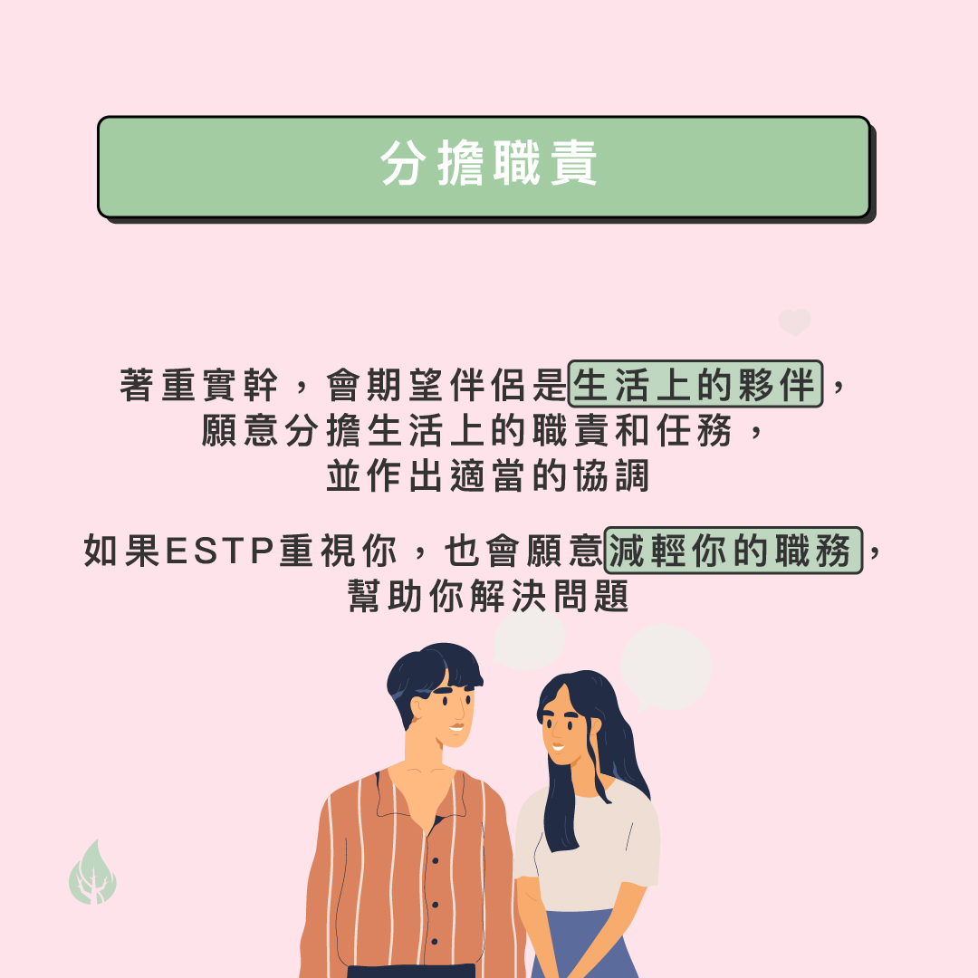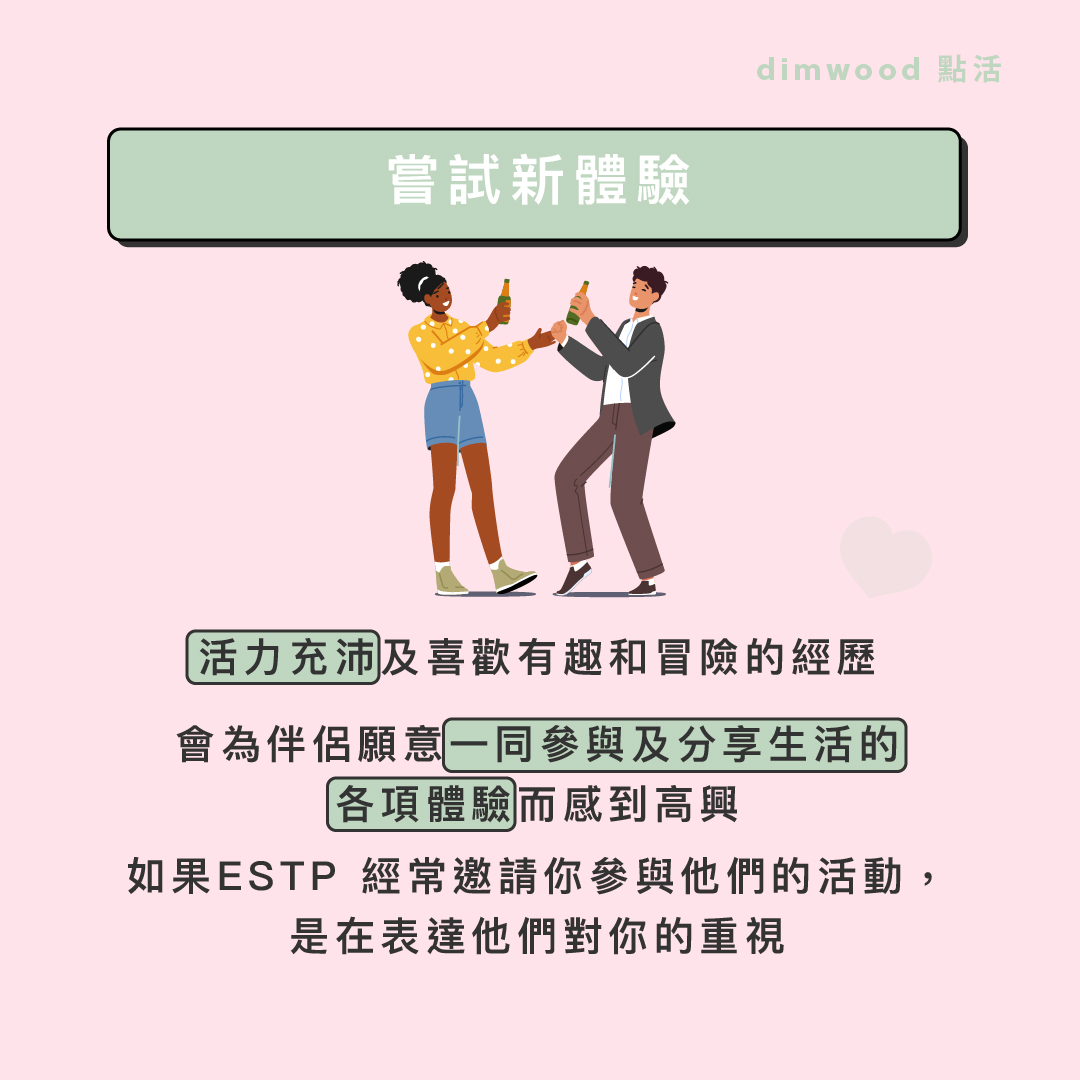 ESTP是有活力、追求體驗生活和獨立性強的人,他們喜歡在保持獨立性的同時可以跟伴侶一同追求生活中的各種樂趣,因此在感情上他們會用以下的方式去表達和接收愛意。 1)嘗試新體驗ESTP的人活力充沛及喜歡有趣和冒險的經歷,如果伴侶願意跟他們嘗試在生活上不同的新體驗,例如一同去旅行、玩刺激的活動、去新的餐廳試新菜式,他們會為伴侶願意一同參與及分享生活的各項體驗而感到高興。所以如果ESTP 經常邀請你參與他們的活動,那也是在表達他們對你的重視。
