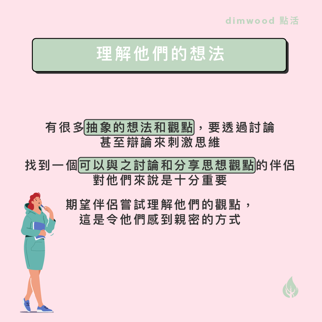 INTP是冷靜、理性、喜歡邏輯分析和獨立的人,他們喜歡和伴侶交流理性的討論和探索新的事物,因此在情感上他們會用以下的方式去表達和接收愛意。 1.理解他們的想法INTP對世界和不同事物有很多不尋常的想法,他們有很多抽象的想法和觀點,並不是每一類型的人都會容易明白他們。因此,找到一個可以與之討論和分享思想觀點的伴侶對他們來說是十分重要的,因為他們要透過討論甚至辯論來刺激思維,交換知識和想法。如果伴侶愛他們,不要限制他們的想像力,嘗試理解他們
