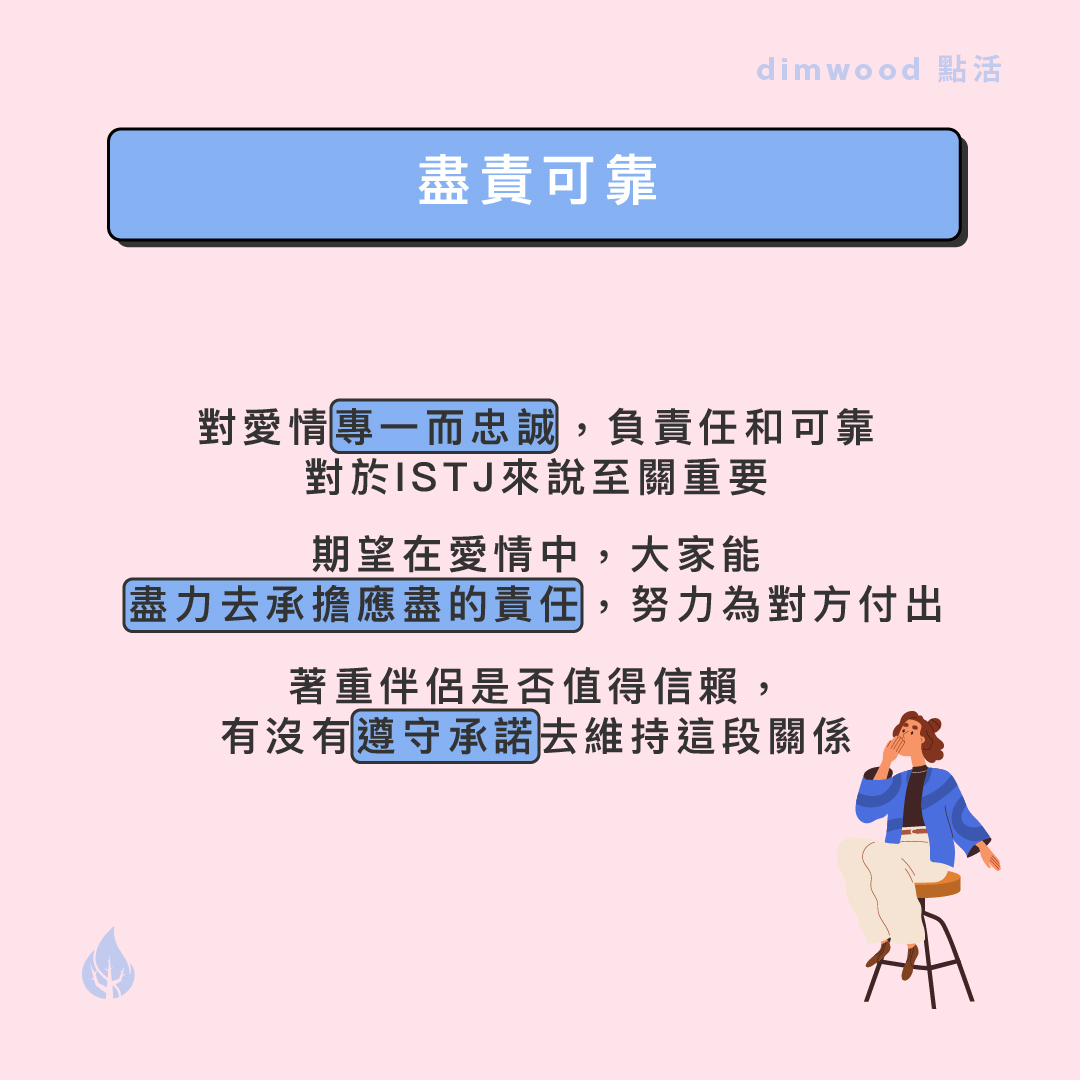 ISTJ是有責任心、勤力、謹慎處事的人,他們透過守承諾、有計劃和規律的生活來維持與伴侶的關係,因此在情感上他們會用以下的方式去表達和接收愛意。 1.盡責可靠 ISTJ對愛情專一而忠誠,因此伴侶負責任和可靠對於ISTJ來說是十分重要。他們期望在愛情中,大家能盡力去承擔應盡的責任,努力為對方付出。因此,無論大至身份角色,小至生活細節,ISTJ都會著重伴侶是否值得信賴,有沒有遵守承諾去維持這段關係,例如答應了他們的事是否如期做到,這對他們來說