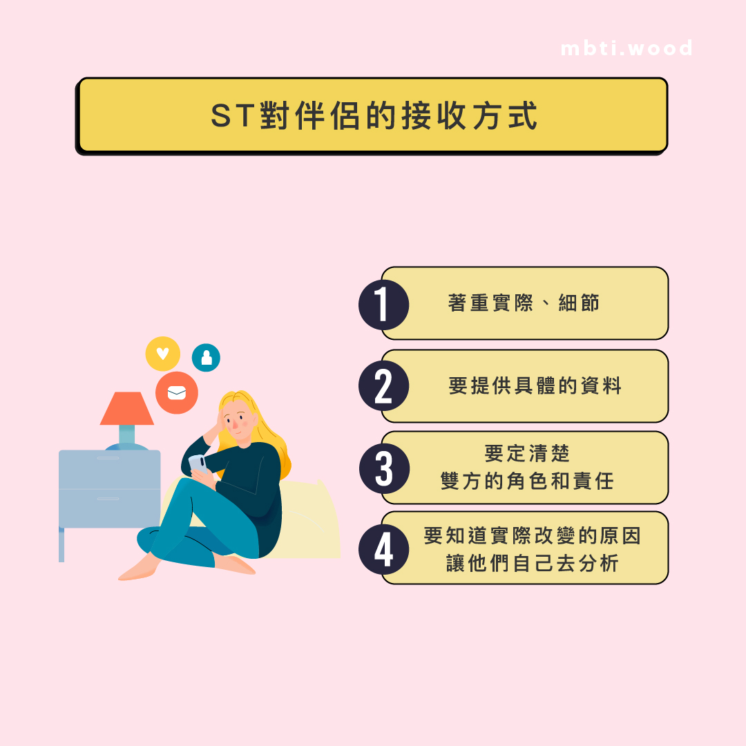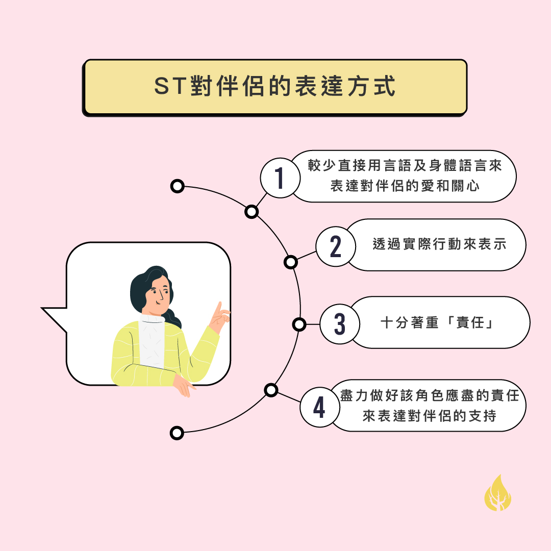 ST類型的人較少直接用言語及身體語言來表達對伴侶的愛和關心,他們會透過實際行動來表示,例如替伴侶辦事,減輕伴侶的負擔。