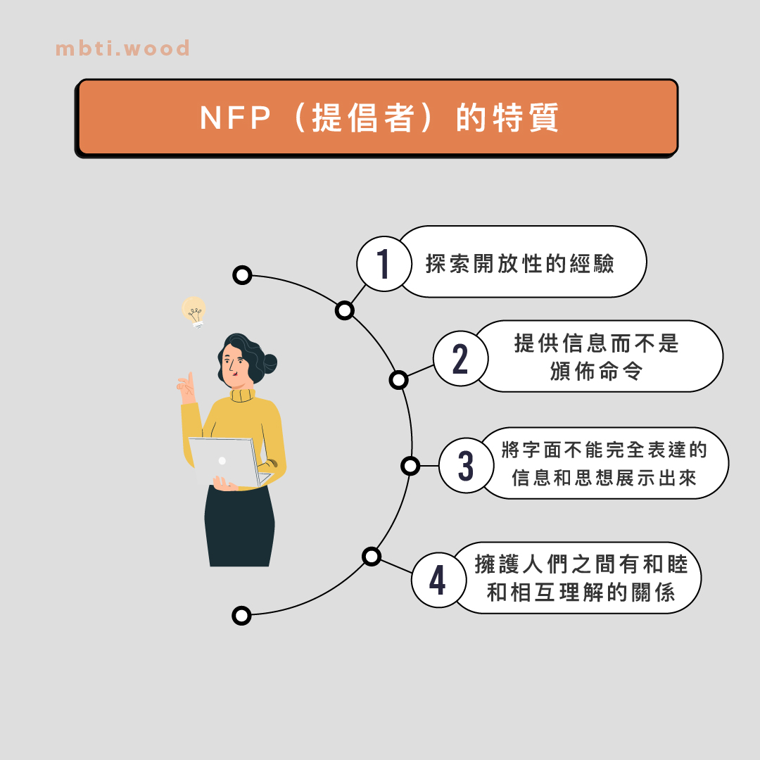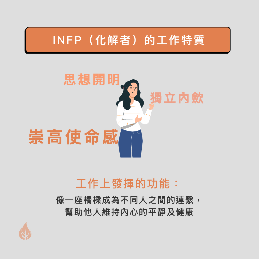 NF(理想主義者)雖然都擁有交際的智能,但是在不同類型中傾向運用的方向和交際的工作方式卻有所不同。NF(理想主義者)可分為NFJ(指導者)及NFP(提倡者)的角色,以他們擅長的技能和持質來發揮交際智能。 【 NFP(提倡者)的特質】 .探索開放性的經驗 .提供信息而不是頒佈命令 .將字面不能完全表達的信息和思想展示出來 .擁護人們之間有和睦和相互理解的關係 【 INFP(化解者)的工作特質】 工作上表現的性格特質:獨立內歛、思想開明、崇