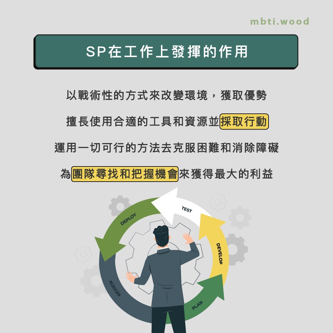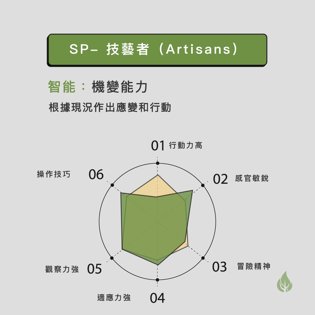 【SP - 技藝者(Artisans)】 智能:機變能力 根據現況作出應變和行動 特點: 1.行動力高 2.感官敏銳 3.冒險精神 4.適應力強 5.觀察力強 6.操作技巧 工作上發揮的作用: 以戰術性的方式來改變環境,獲取優勢 擅長使用合適的工具和資源並採取行動 運用一切可行的方法去克服困難和消除障礙 為團隊尋找和把握機會來獲得最大的利益 角色:軍隊中的特種部隊 SP的人就像軍隊中的特種部隊,以行動來支援團隊達到任務目標。他們富有冒險