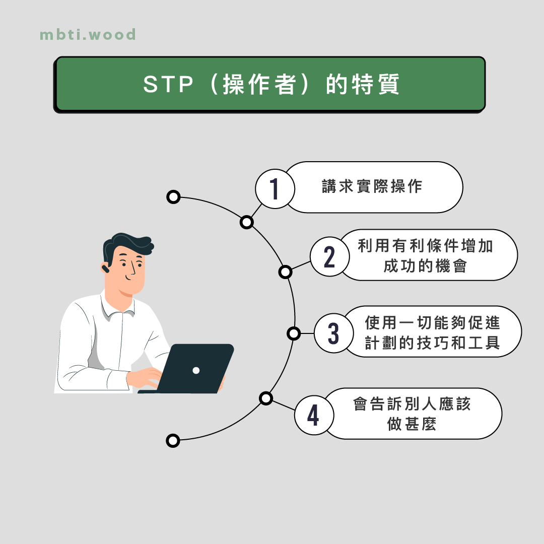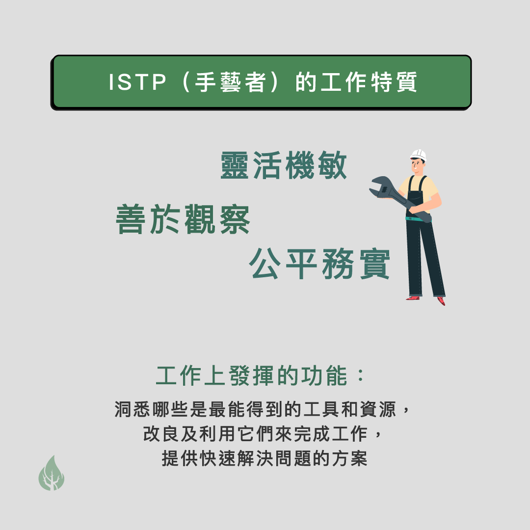 SP(技藝者)雖然都擁有機變的智能,就是在當下根據現況採取行動改善狀況的技能,SP仍可以細分為STP(操作者)及SFP(演藝者)的角色,以他們擅長的技能和特質來發揮機變智能。 【 STP(操作者)的特質】 講求實際操作 利用有利條件增加成功的機會 使用一切能夠促進計劃的技巧和工具 會告訴別人應該做甚麼 【 ISTP(手藝者)的工作取向】 工作上表現的性格特質:靈活機敏、善於觀察、公平務實 工作上發揮的功能:洞悉哪些是最能得到的工具和資源