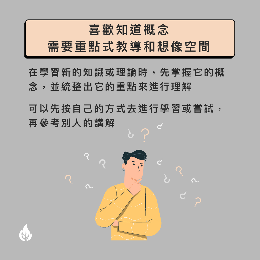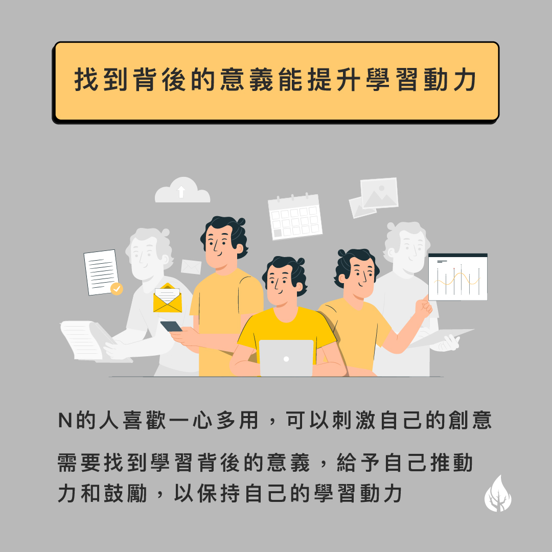 學習攻略 1)喜歡知道概念,需要重點式教導和想像空間 在學習新的知識或理論時,先掌握它的概念,並統整出它的重點來進行理解 可以先按自己的方式去進行學習或嘗試,再參考別人的講解 2)喜歡新的學習方式,需要創意的課堂活動和開放式問題 特別在家學習時,為自己營造一個能刺激創意及思維的學習環境 給自己適當的挑戰,多運用不同角度或方式去解難 3)找到背後的意義能提升學習動力 N的人喜歡一心多用,可以刺激自己的創意 需要找到學習背後的意義,給予自己